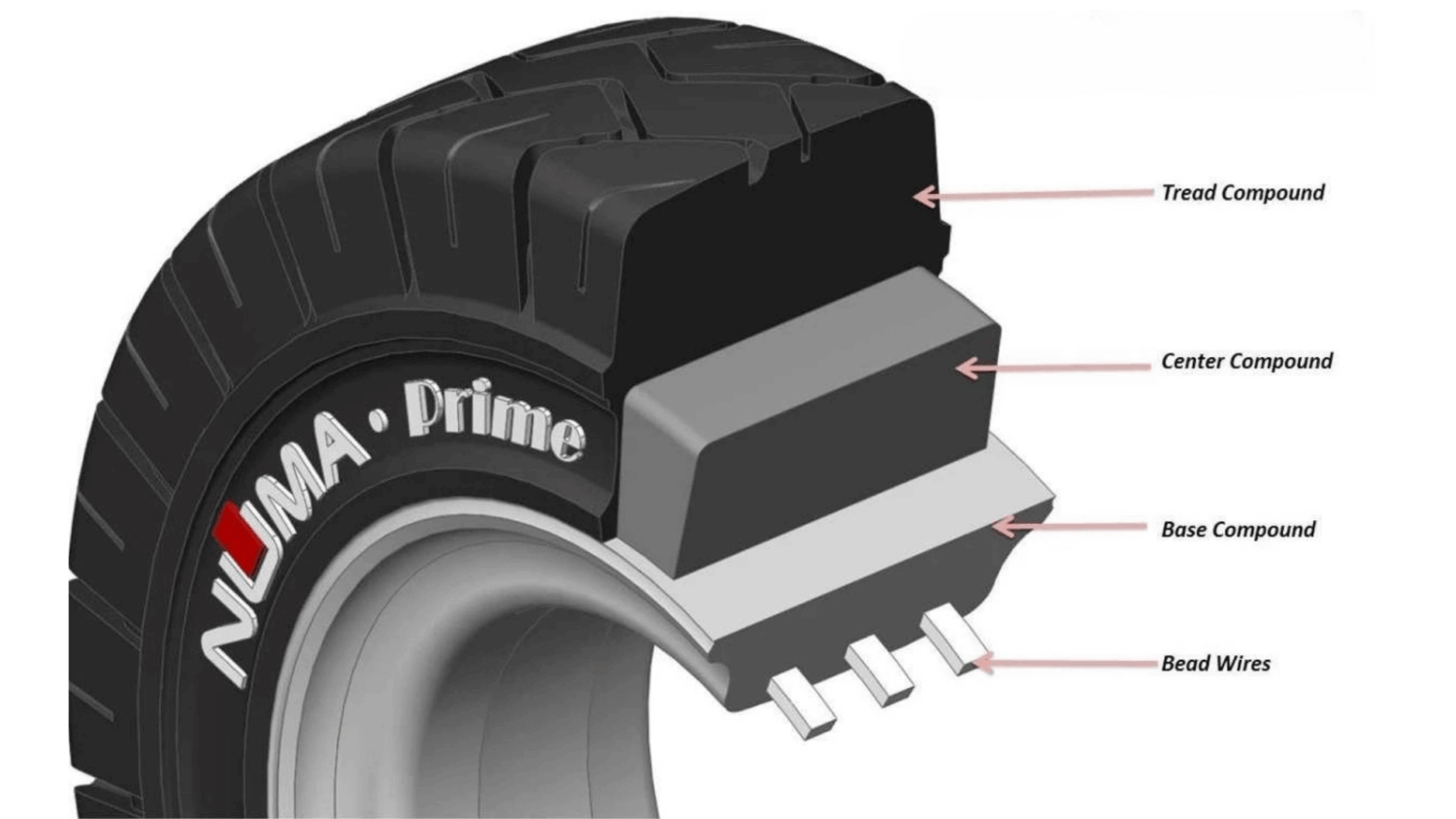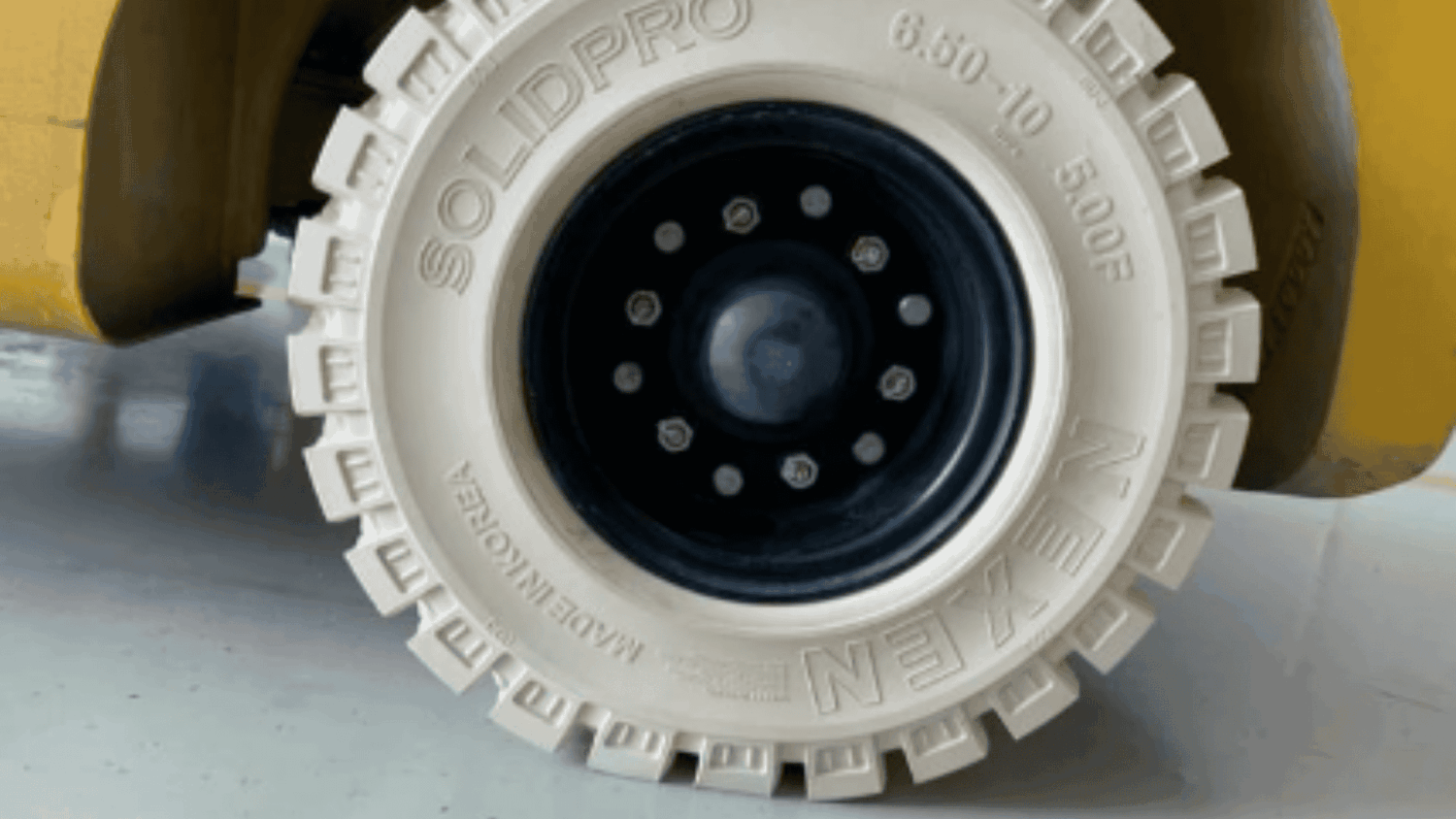 Cấu tạo: Đây không phải là một loại cấu trúc lốp riêng biệt mà là một biến thể đặc biệt của các loại lốp trên (hơi, đặc, PU). Chúng được sản xuất bằng cách sử dụng Hydrated Silicas và các phụ gia đặc biệt thay thế cho Carbon Black (than đen) – thành phần tạo màu đen và gây ra vệt trên sàn. Lốp non-marking thường có màu trắng ngà hoặc xám.
