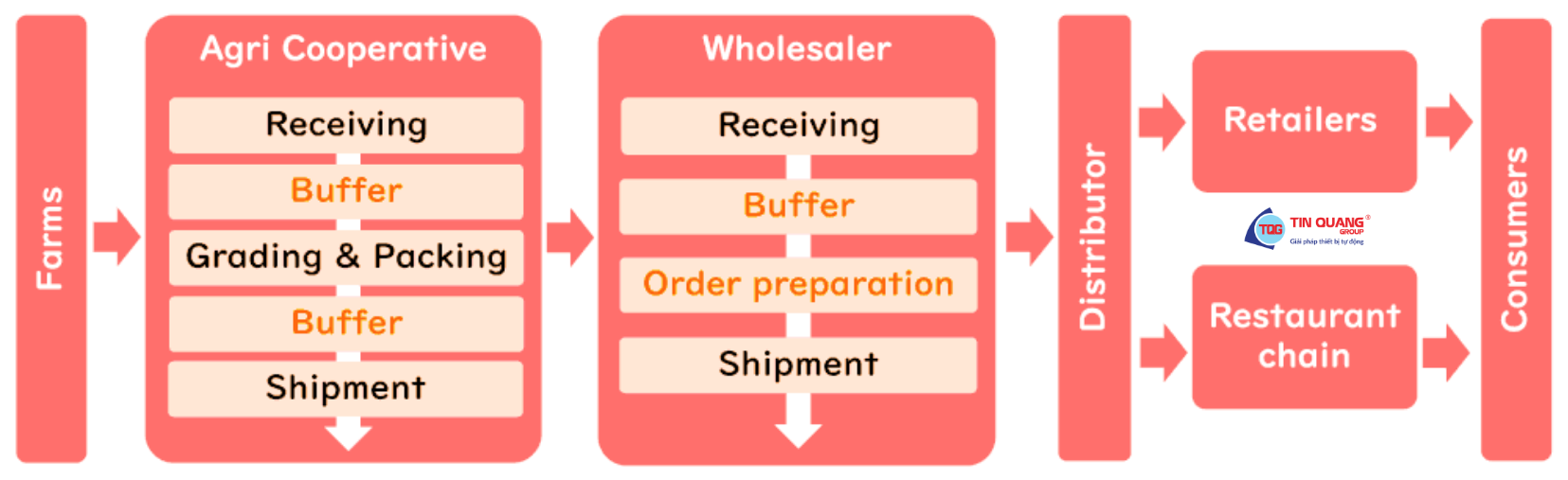 Song song đó, các nhà bán buôn, sau khi thu mua nông sản từ các hợp tác xã, cần thiết lập hệ thống bảo quản lạnh nhằm duy trì độ tươi ngon hoặc thúc đẩy quá trình chín trước khi phân phối đến các nhà bán lẻ. Tin Quang Group cung cấp các giải pháp lưu trữ tự động, được thiết kế riêng biệt cho từng loại nông sản, nhằm hỗ trợ các nhà phân phối tối ưu hóa quy trình làm việc và nâng cao hiệu quả hoạt động.