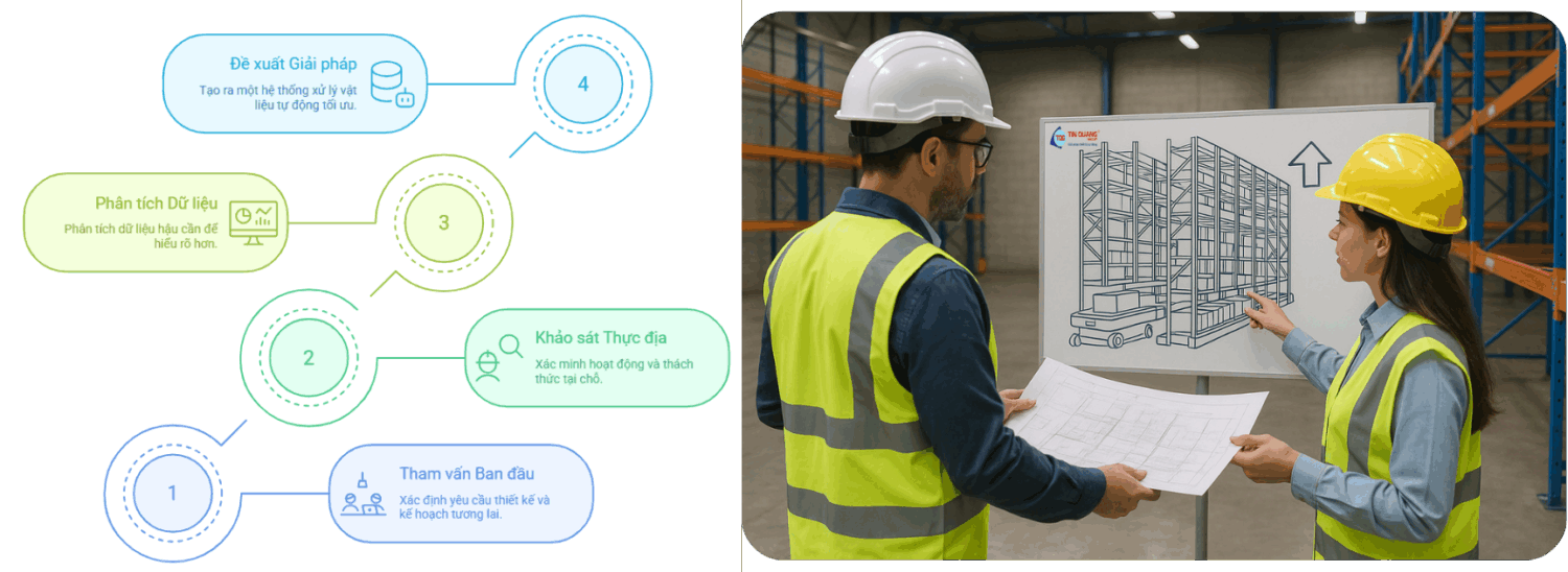 Dựa trên các cuộc họp, khảo sát thực địa và phân tích dữ liệu hậu cần, Tin Quang Group tạo ra giải pháp cho hệ thống xử lý vật liệu tự động tối ưu không chỉ cải thiện năng suất, giảm lao động và đạt được các mục tiêu khác của bạn mà còn có thể linh hoạt ứng phó với những thay đổi trong tương lai của doanh nghiệp bạn.