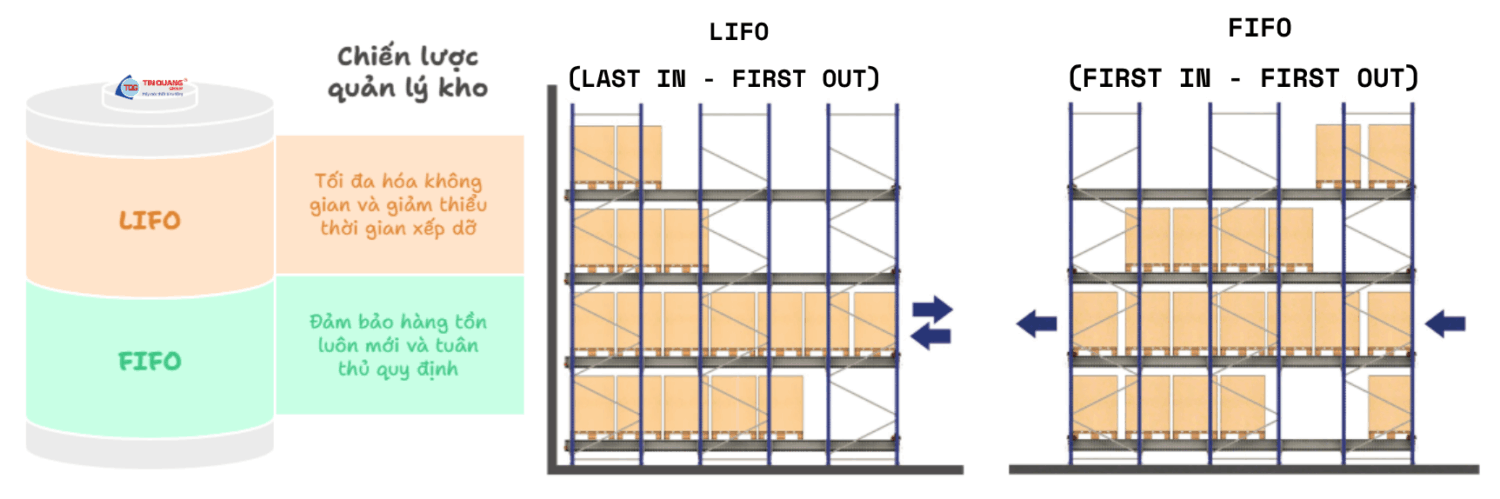 Ngược lại, chế độ LIFO thường được áp dụng trong những kho chứa hàng không yêu cầu kiểm tra thời hạn, như kho thép, kho vật liệu xây dựng hoặc các mặt hàng có thể tồn trữ lâu dài mà không bị hỏng hóc. Trong LIFO, pallet hàng mới nhất sẽ được lấy ra trước, giúp tận dụng tối đa không gian kho và giảm thiểu thời gian xếp dỡ.