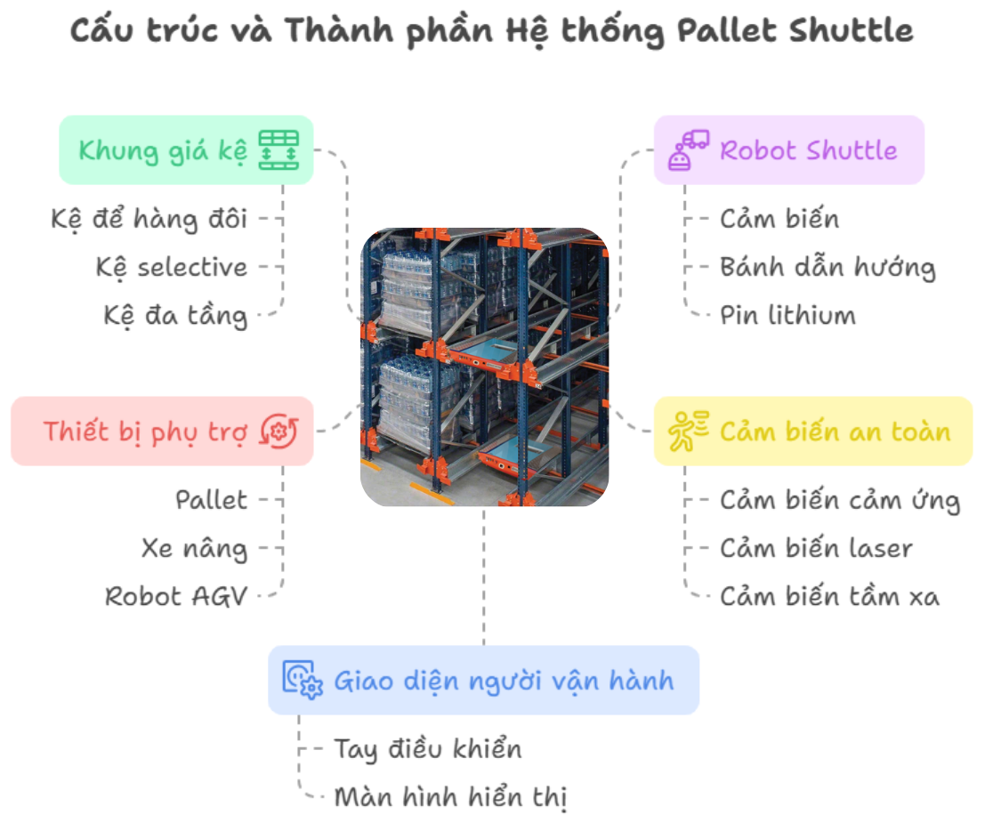 Hệ thống Pallet Shuttle hiện đại bao gồm nhiều thành phần cấu thành phức hợp nhưng đồng bộ, nhằm đảm bảo quá trình vận hành suôn sẻ, an toàn và hiệu quả. Từ khung kệ, robot shuttle, cảm biến, hệ thống dẫn hướng, đến thiết bị điều khiển đều đóng vai trò quan trọng trong bức tranh tổng thể của giải pháp kho tự động.