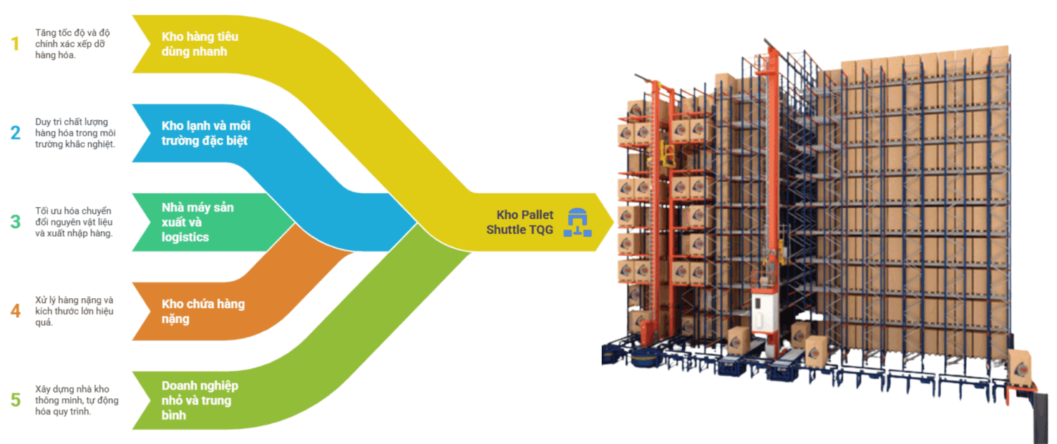 Hệ thống Pallet Shuttle đã và đang được ứng dụng rộng rãi trong nhiều lĩnh vực, mang lại lợi ích vượt trội về năng suất, độ chính xác và tối ưu không gian. Đặc biệt, các ngành công nghiệp như logistics, bán lẻ, sản xuất có thể tận dụng sức mạnh của công nghệ tự động hóa để nâng cao hiệu quả vận hành kho bãi của mình.
