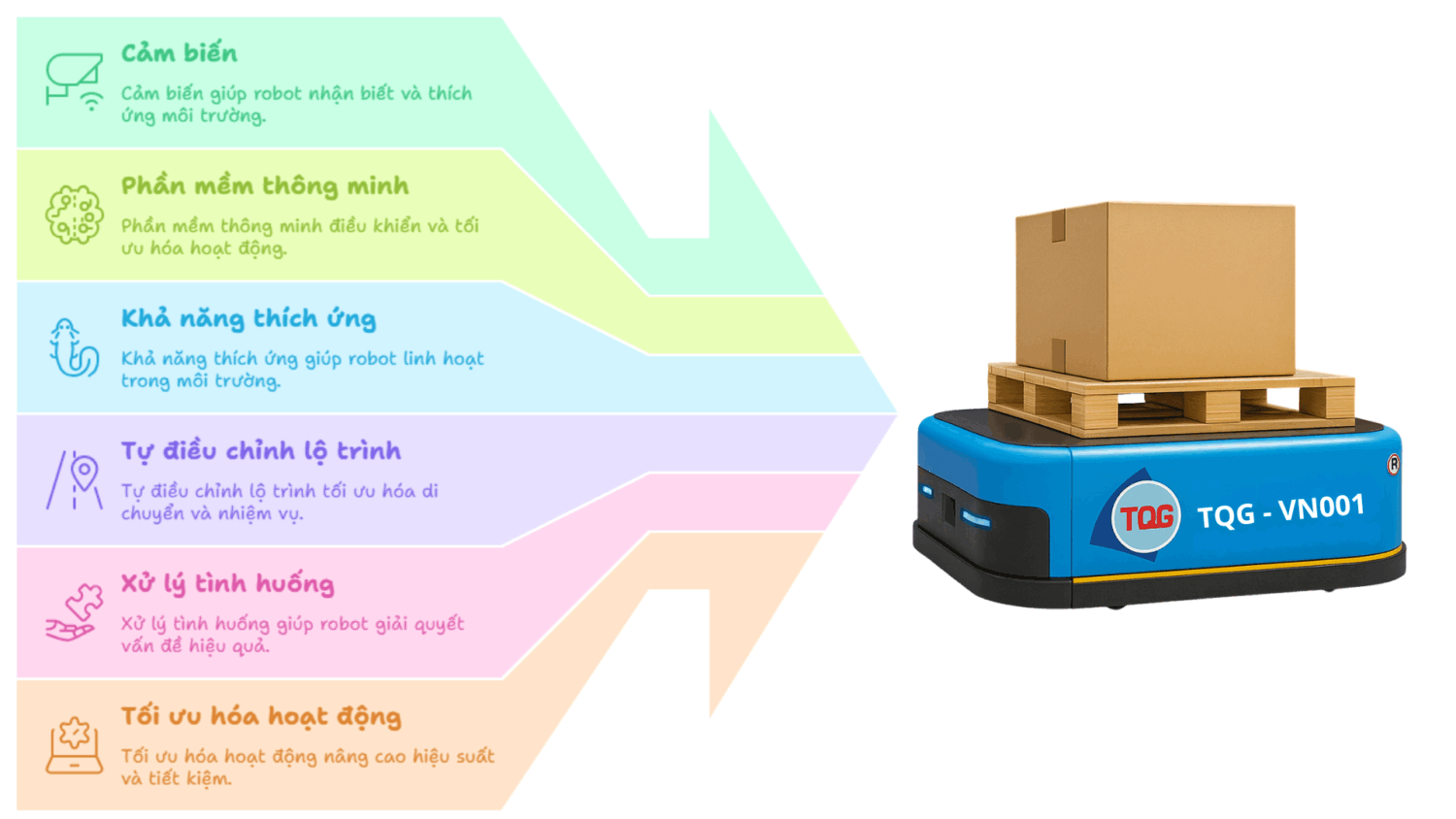 Trong các hệ thống tự động, robot tự hành mang lại nhiều lợi ích rõ rệt như giảm chi phí nhân công, nâng cao năng suất và đảm bảo độ chính xác trong vận hành. Các đặc điểm nổi bật gồm khả năng hoạt động liên tục, thích nghi nhanh với thay đổi môi trường, khả năng tải trọng lớn và hoạt động trong nhiều điều kiện môi trường khác nhau từ công nghiệp nặng đến trong nhà máy điện tử, kho hàng logistics hay trung tâm thương mại.