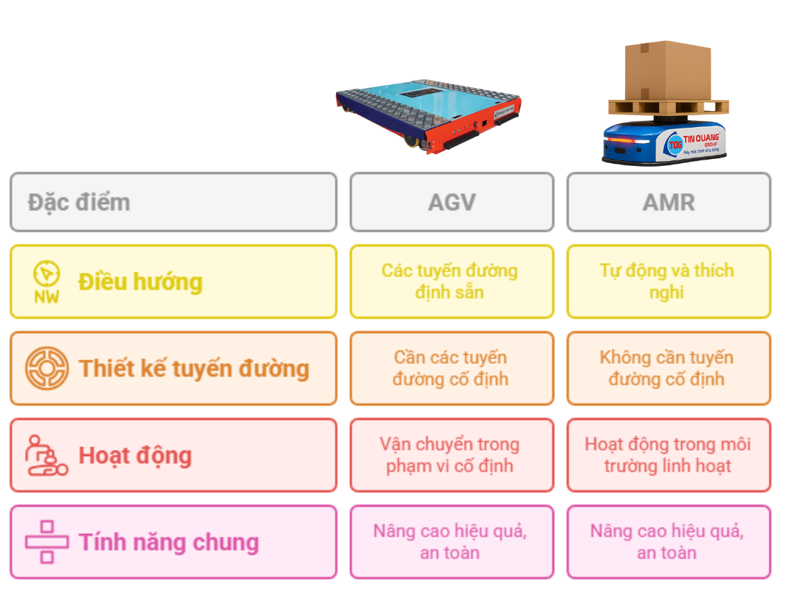 Trong đó, AGV nổi bật với khả năng hoạt động dựa trên các tuyến đường định sẵn, thích hợp để vận chuyển hàng hóa trong phạm vi cố định. Ngược lại, AMR sở hữu khả năng tự lập trình và thích nghi linh hoạt với môi trường, giúp chúng dẽ dàng hoạt động trong không gian phức tạp hơn và không cần thiết kế tuyến đường cố định. Điểm chung của hai loại này là khả năng nâng cao hiệu quả vận hành, giảm chi phí và đảm bảo an toàn trong quá trình hoạt động.