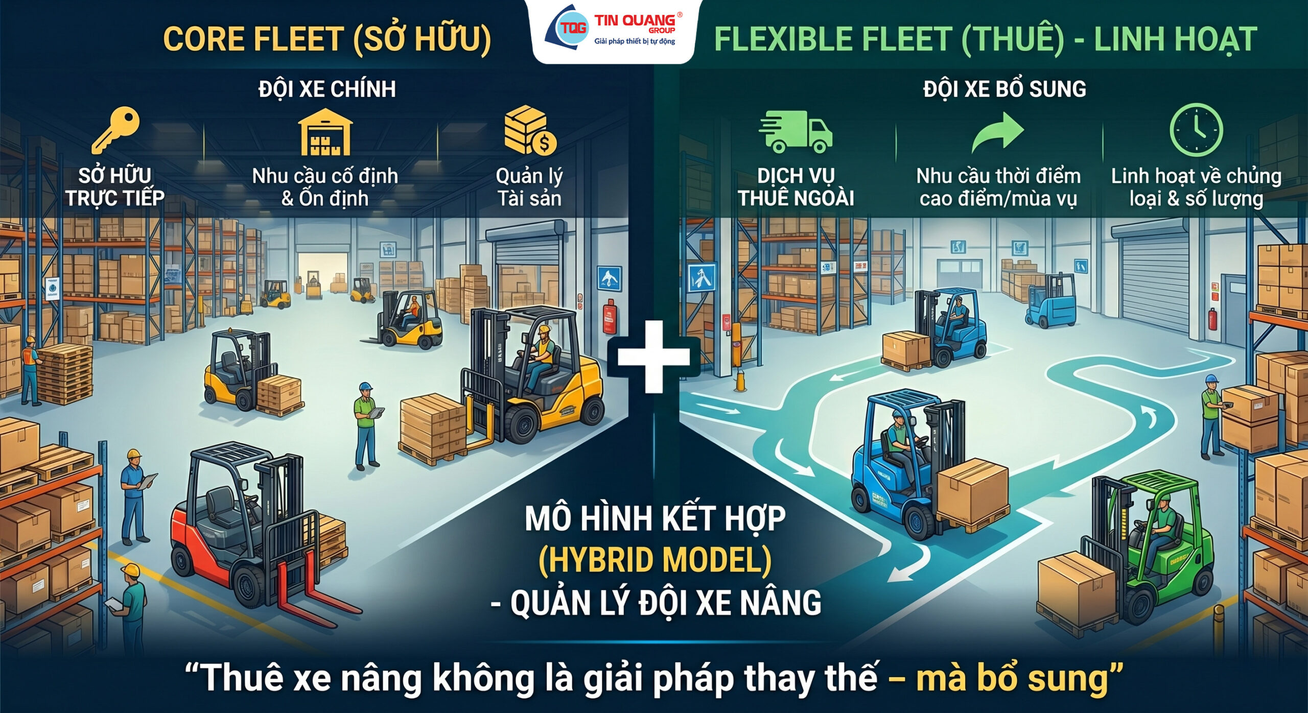 Nhiều doanh nghiệp hiện nay không chọn tuyệt đối một mô hình, mà kết hợp giữa xe nâng sở hữu và xe nâng thuê. Theo đó, doanh nghiệp duy trì một đội xe lõi cho nhu cầu thường xuyên, đồng thời thuê bổ sung trong giai đoạn cao điểm hoặc khi cần thêm dòng xe chuyên biệt.